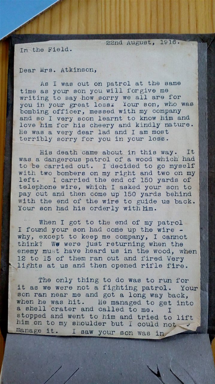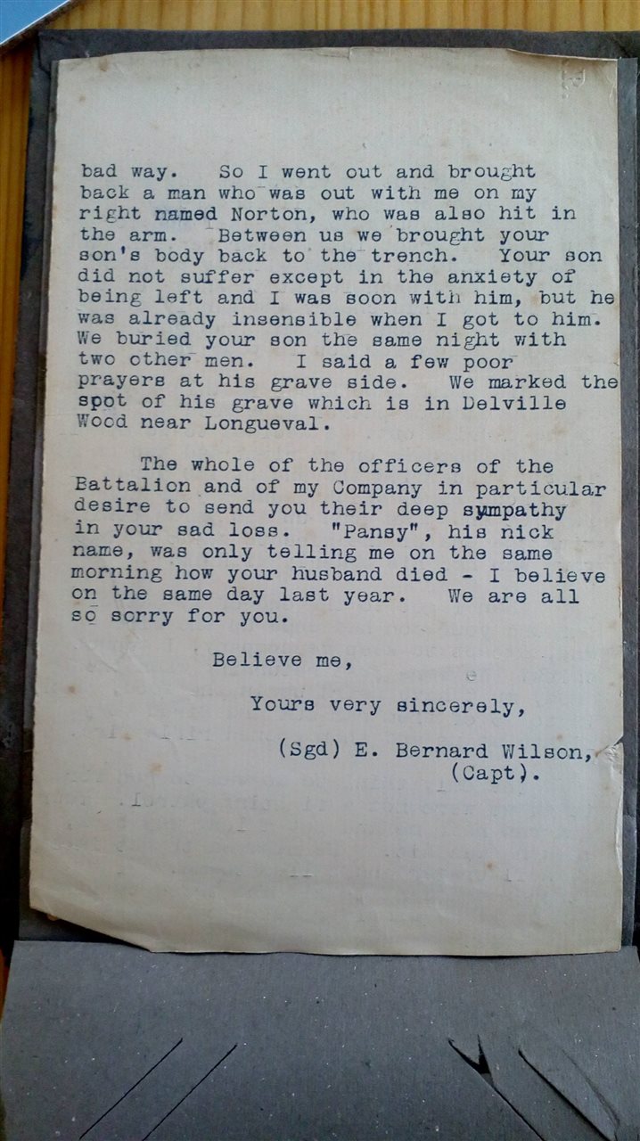 His Colonel (G. Meryill) wrote of him, "although he had only been a short time with me I had already noticed him as a young officer of exceptional promise, full of dash and keenness, for which qualification he was selected as Bombing Officer. He was always ready for a dangerous job and was a typical specimen of the best type of young officer. His death is deplored by us all".