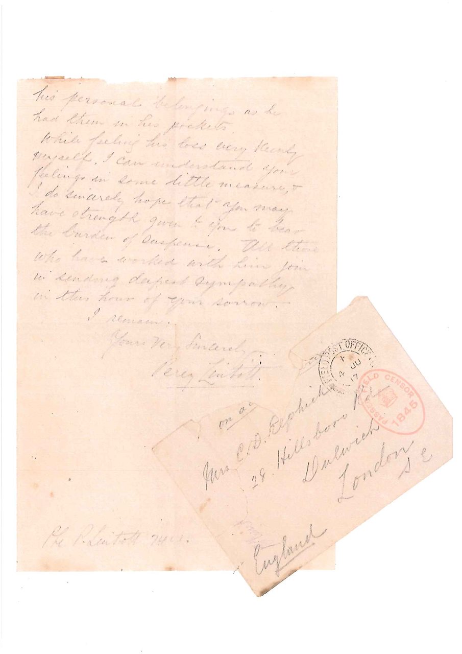 See the gallery above to view the 'Elphick Room' at King's Cross as well as a Christmas card sent home by Elphick in 1916. The gallery also contains a letter sent by Private Percy Lintott to Christopher's widow, Hilda after he went Missing in Action in May 1917. A transcript of this letter is available to view in the gallery along with images of Elphick's war medals, pocket watch and the Memorial Plaque (medallion) that was issued to Hilda as Christopher's next-of-kin. Double click these images to enlarge them.