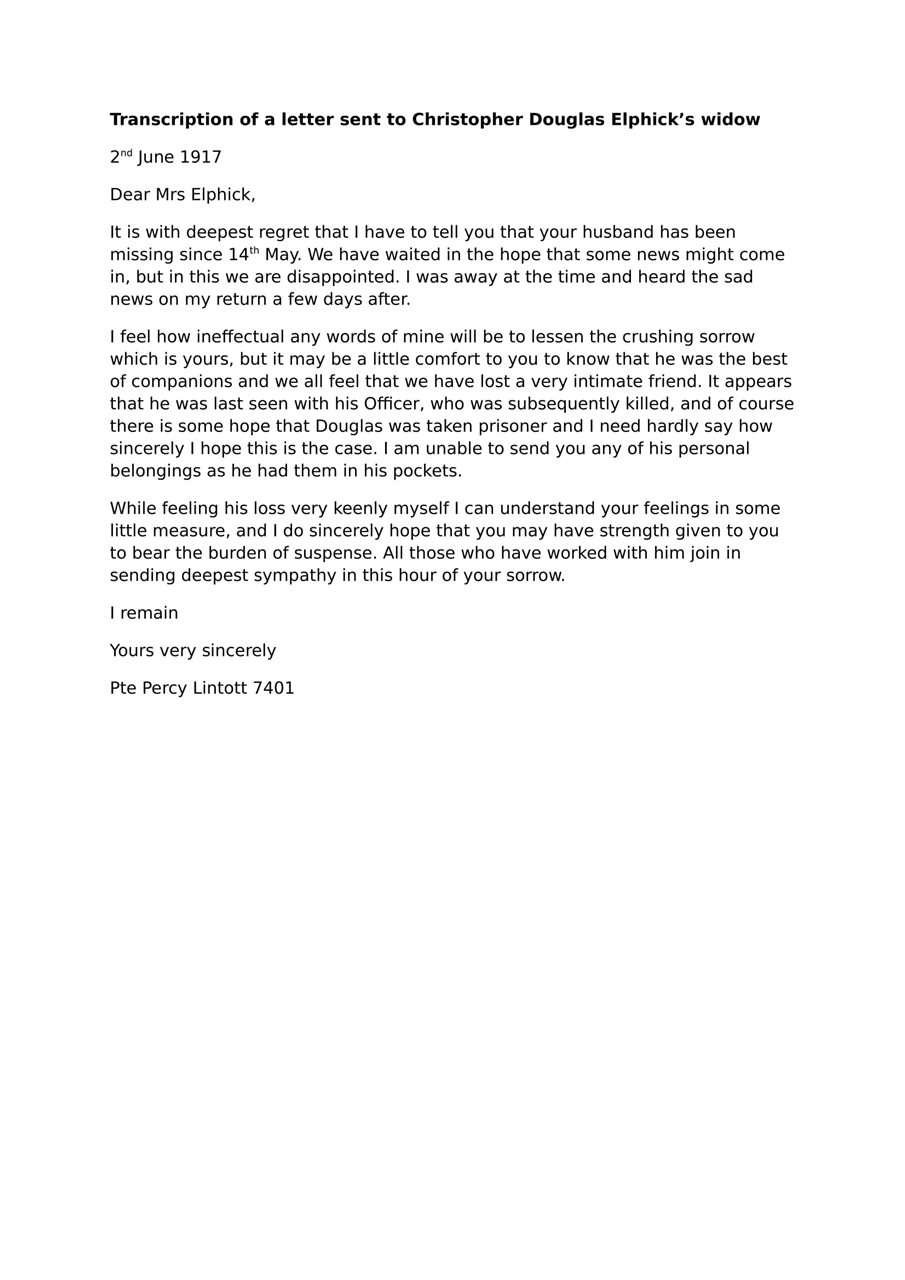 The reburial of Christopher Douglas Elphick was covered by the British media and this unique story generated a new wave of interest in the war in England, inspiring a real desire to preserve the memory of the fallen of the First World War. This resulted in a waiting room at King's Cross being named, ‘The Elphick Room’, an apt tribute to an ordinary, young London boy who worked in the City and fought in the war.
