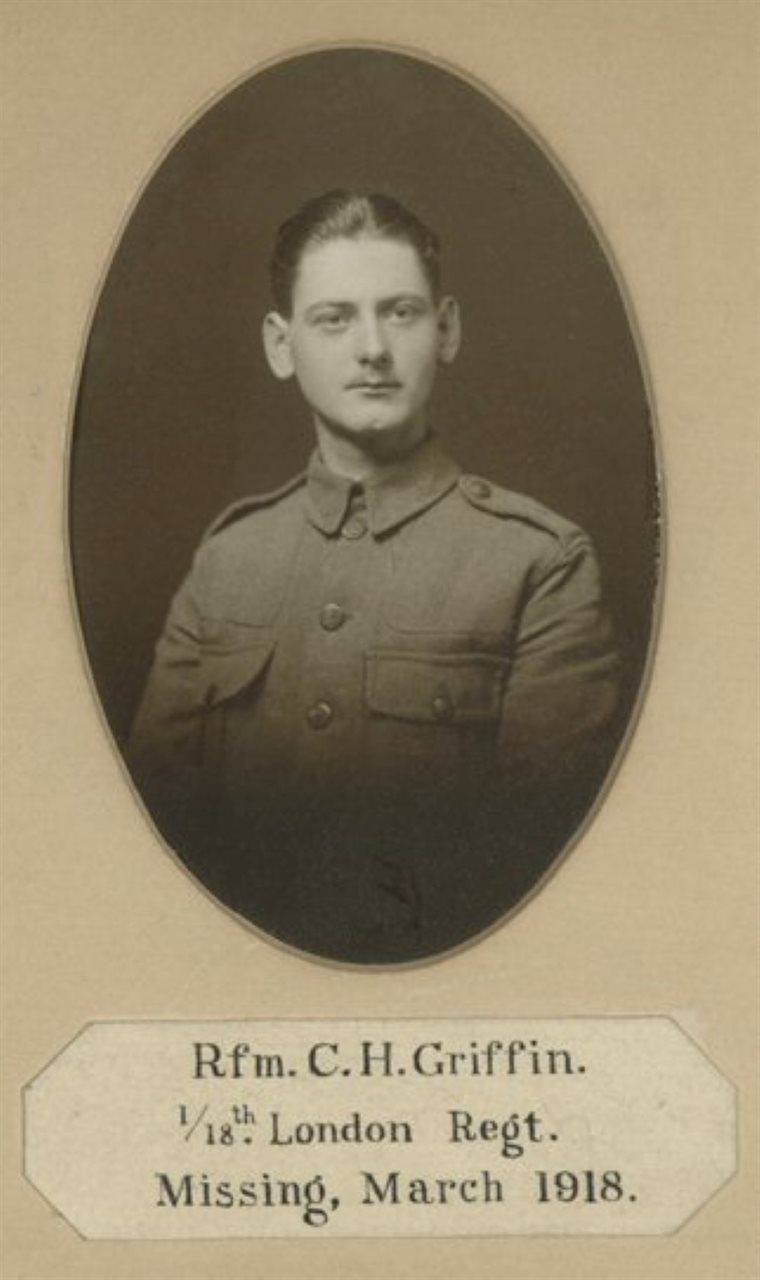 Cedric Howard Griffin was born in 1899, the son of William John and Amy Ellen Griffin. He was educated at Alleyn’s from 1911 until 1914, and upon leaving school he became a Junior Clerk in the Railway Passenger Assurance Company.