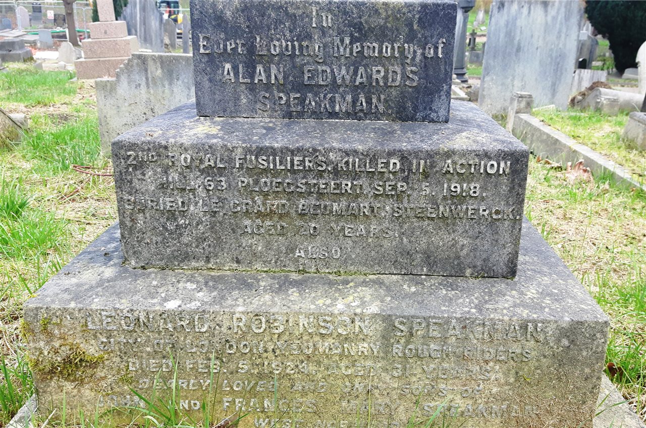 Alan Edwards Speakman was a student at Alleyn’s until 1916 and lived with his parents, John and France, at 199 Casewick Road, West Norwood. During his time at school, Alan was a Prefect and was known by many as a keen and useful member of Roper’s House. After leaving school, he was granted a commission in the Royal Fusiliers and was sent for officer training. After completing this training, he received the rank of 2nd Lieutenant and was sent for service overseas on the Western Front. In 1918, he was serving in France when he was killed in action by sniper while leading his platoon in an advance between Ploegsteert and Hill 63.