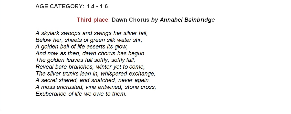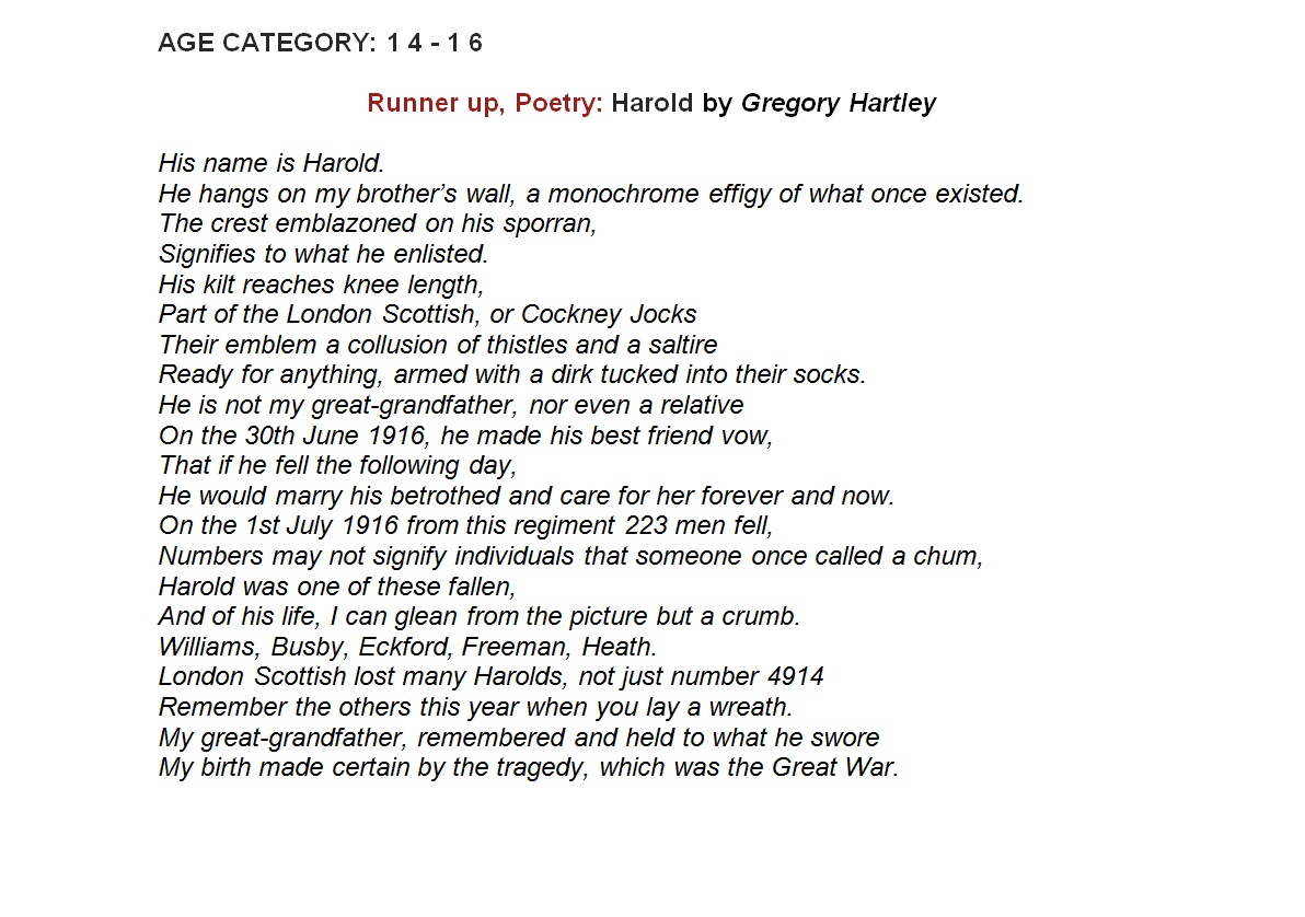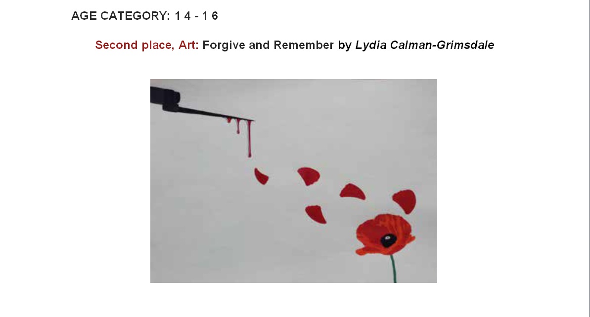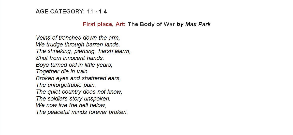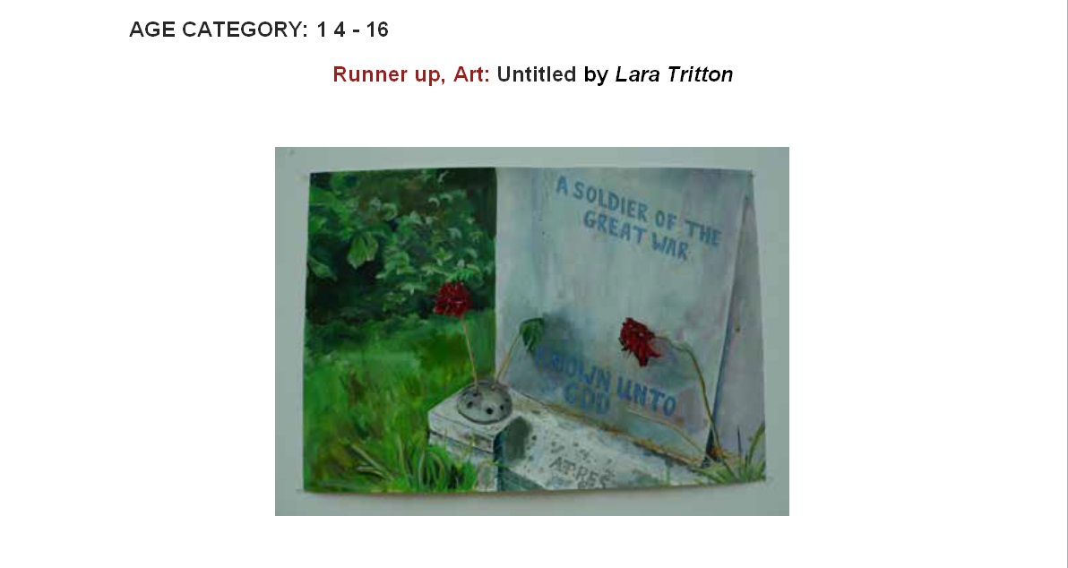 In 2014, Alleyn's students took part in the Never Such Innocence competition to commemorate the centenary of the Great War. The competition asked students to choose a topic related to the First World War and produce a piece of art or compose a poem that conveyed their thoughts and feelings. The competition was split into secondary and primary school entries and each piece of work was judged by a panel of four judges. Each work of poetry or art had the opportunity to win first, second, third or a runner up place in the competition. Overall, 183 art entries and 376 poetry entries were submitted to Never Such Innocence competition. Alleyn's was recognised by the judges for the high standard of poetry and art submitted and each pupil that entered was awarded a certificate of commendation for their work. Five Alleyn's students were also among the winners of the competition and their prize work can can viewed in the gallery below.